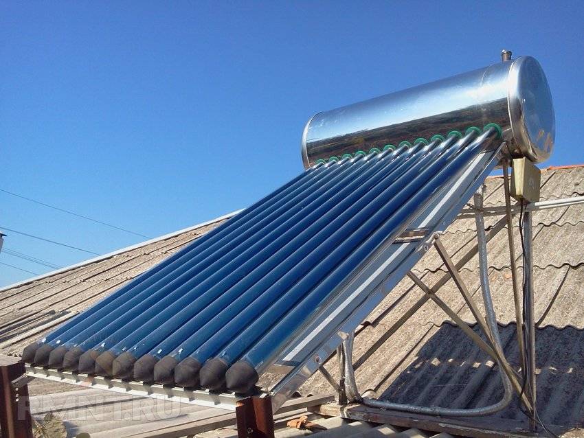 Первые объединены в один так называемый «водонагреватель», который располагается на кровле. Резервуар с теплоносителем находится выше отметки коллектора, а холодная вода в бак подается снизу.