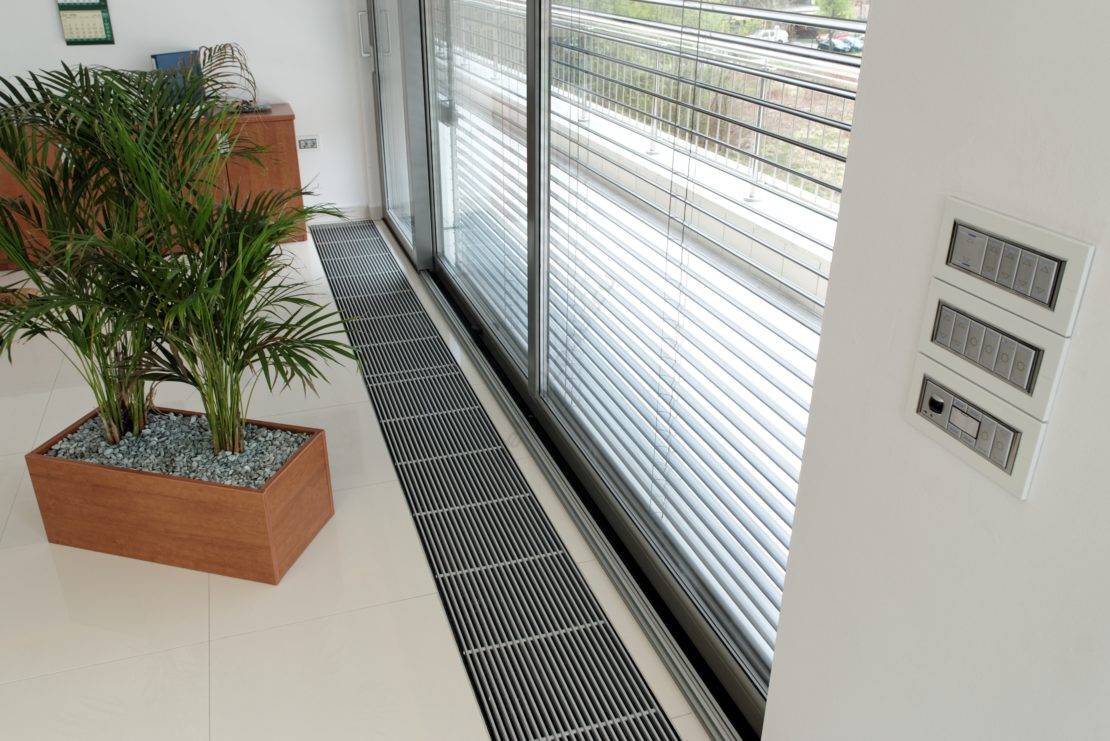 Чаще всего, обогрев подобных помещений возлагают на внутрипольные конвекторы. Это самое очевидное и простое решение с точки зрения дизайна: конвектор не бросается в глаза, не закрывает вид из окна и при этом располагается прямо под окном, надежно защищая окно от конденсата. Внутрипольные конвекторы удобны также для дизайнеров интерьеров: они могут никак не учитывать отопительные приборы в своем проекте, предполагая, что это будут незаметные конвекторы в полу. Большинство производителей предоставляют возможность покраски декоративной решетки в цвет напольного покрытия.