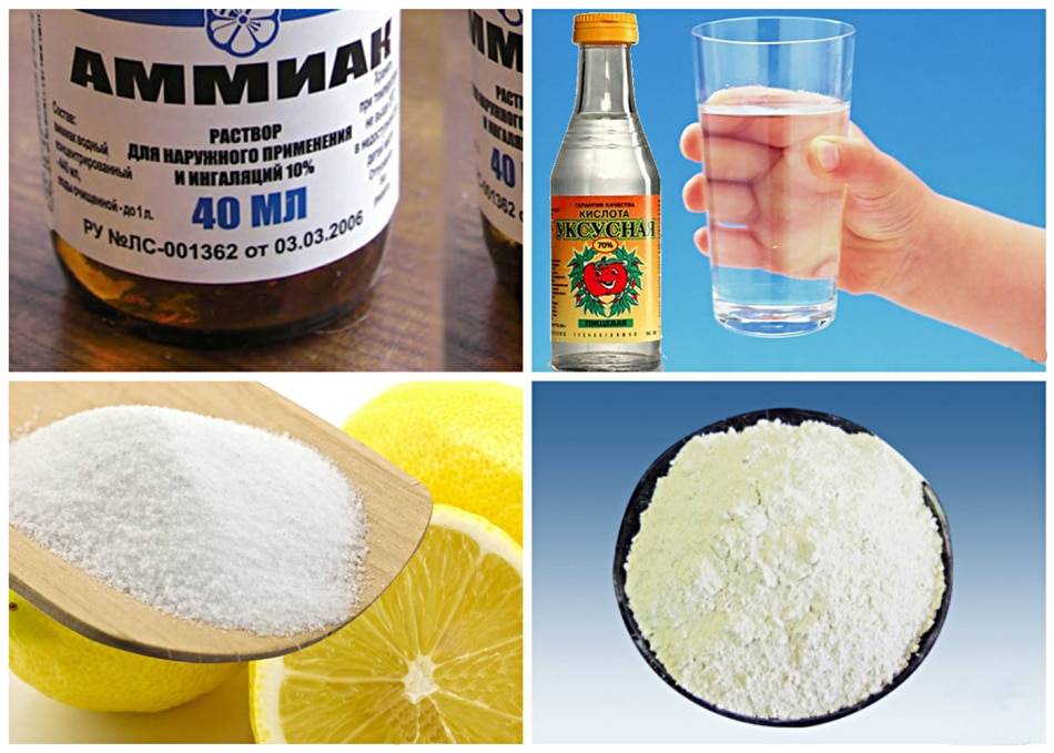 - Отлично справится с мыльным раствором состав из соды, нашатырного спирта и уксуса. На 1,5 л воды 7 столовых ложек соды, 4 – уксуса и 5 – нашатырного спирта. Жидкость оставить на 40 минут, а затем тщательно смыть.
