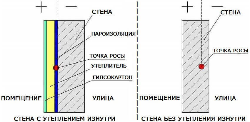 - Достаточно высокая предрасположенность, к выпадению конденсата. Такое явление, как правило, образуется на внешней стороне, в результате контакта стены с теплым воздухом. Теплотехники, подобное, называют точкой росы. Главная задача теплоизоляции стеновой конструкции, сдвинуть точку росы за пределы стены. Утепление изнутри, как показывает практика, обеспечивает смещение конденсата, промеж стены и утеплителя. Это внутренний процесс и, поэтому, скрыт от глаз домовладельцев. Но вредность влаги, всем прекрасно известна. Она хорошо провоцирует размножение, различных микроорганизмов.