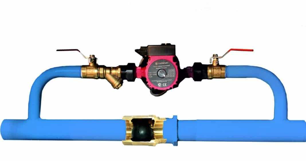 - Разрыв магистрали дополняется готовым комплектом в виде байпаса с обратным клапаном и насосом.