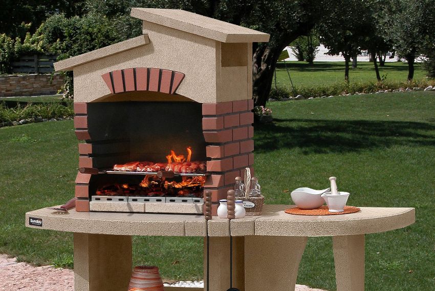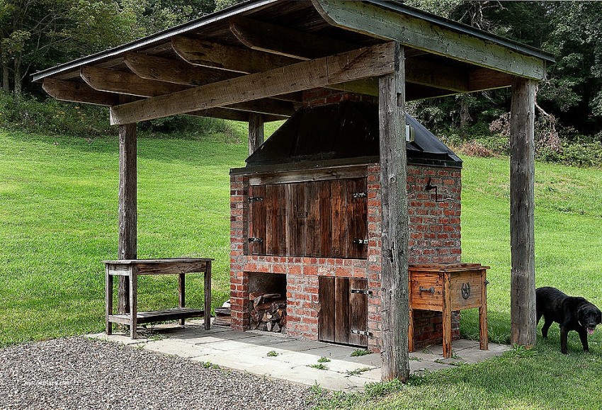 Если хотите, установите рядом с барбекю столик и пару скамеек. Дополнительно в такой ситуации рекомендуется подумать над обустройством навеса.