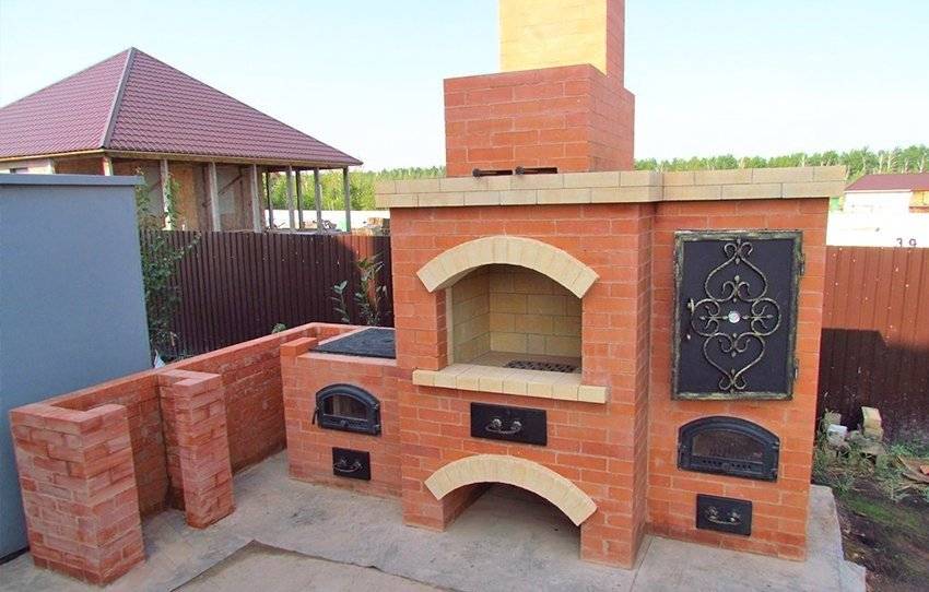 Мангалы со сложной конфигурацией имеют вид массивной постройки. Встречаются даже целые комплексы строений универсального назначения. Несмотря на различия в дизайне, большинство изображенных на фото уличных печей и мангалов из кирпича имеет похожую раскладку и структуру.