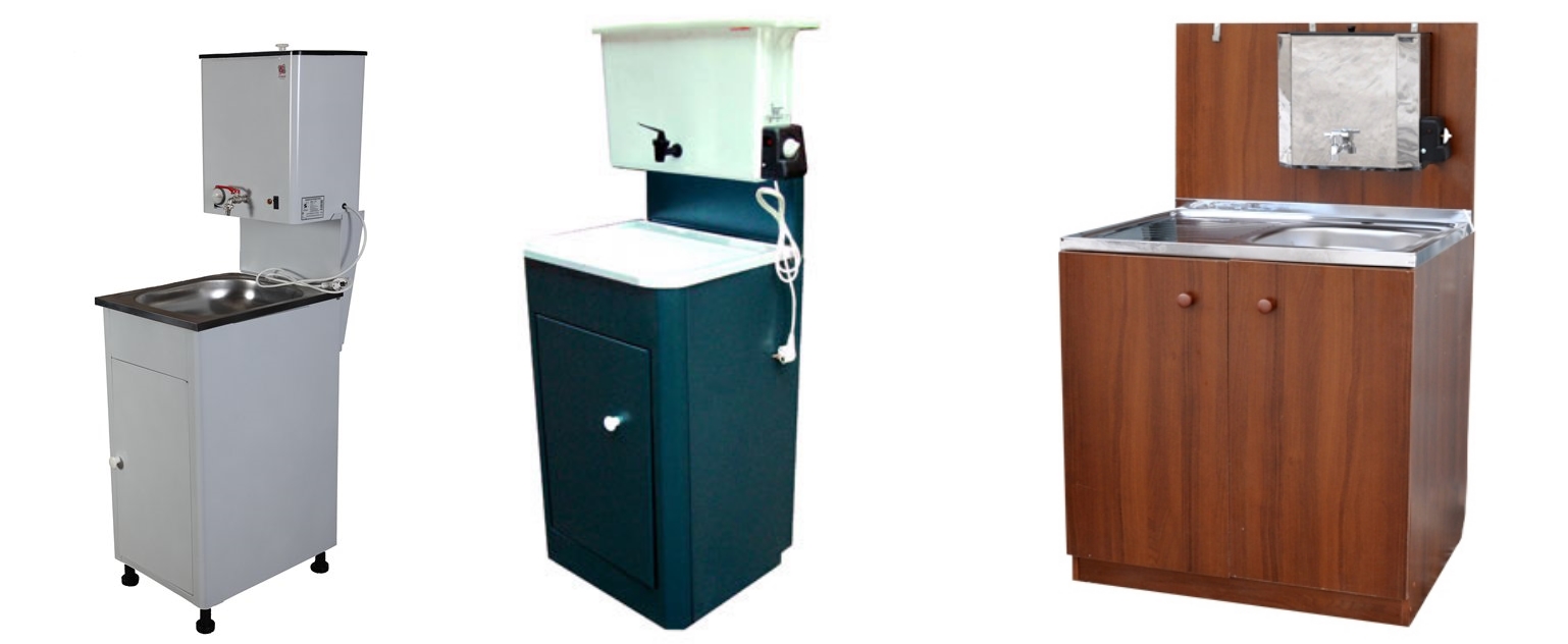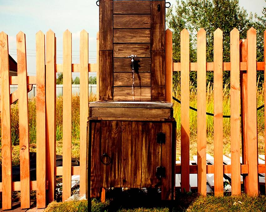 Умывальник с тумбой. Это всем известный «Мойдодыр» в современном варианте. Его раковина удобно закреплена на специальной тумбе, ведро под ней скрыто от глаз за дверцей, нагревающих бак располагается над умывальником. Благодаря функции нагрева воды вы с легкостью сможете перемыть посуду, или просто помыть руки после работы в саду.