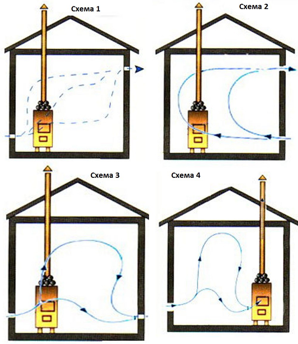 Различают следующие схемы вентиляции в бане.
