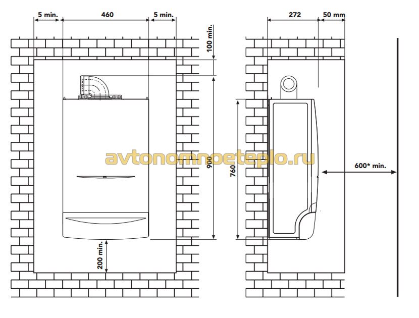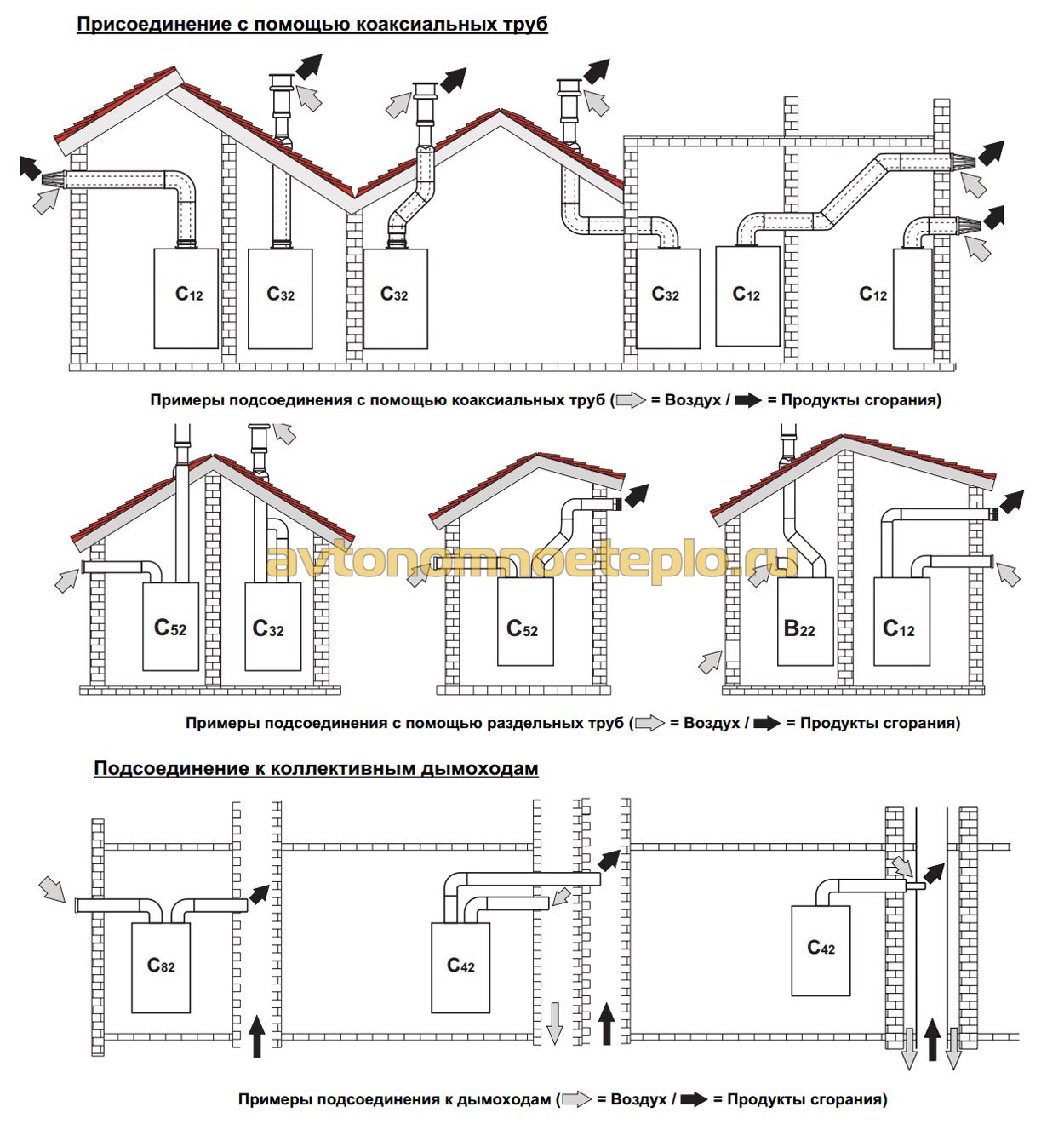 Конденсационные котлы подключаются к горизонтальному коаксиальному дымоходу. Модели с закрытыми топочными камерами подключаются к системе энергоснабжения дома. Забор воздуха, удаление продуктов сгорания осуществляется принудительно с помощью вентиляторов.