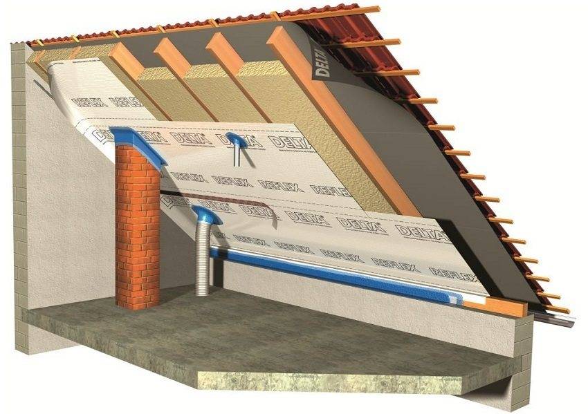 В качестве гидроизоляции рекомендуется применять мембрану диффузионного типа, которая пропускает пар без его блокировки и не допускает влажности в помещении. Необходимо, чтобы между теплоизоляционным слоем и гидроизоляционным материалом оставались вентиляционные отверстия не менее 50 мм. Конечной целью является удаление избыточной влаги.