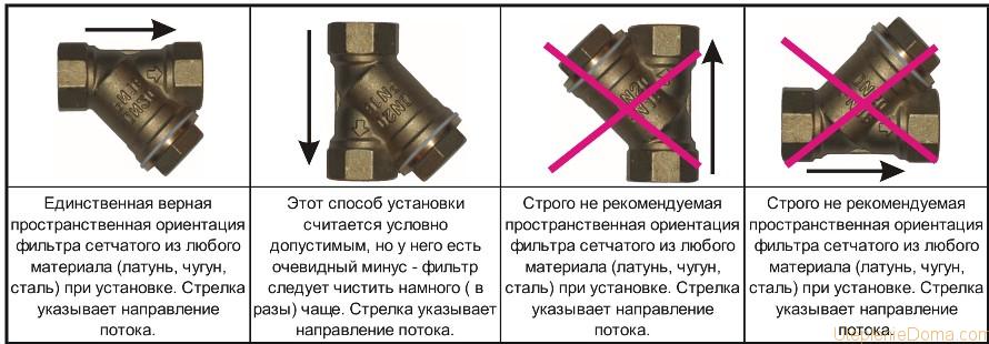 - Пространственная ориентация. Ответвление с сеткой и гайкой либо сливным краном должно смотреть вниз.