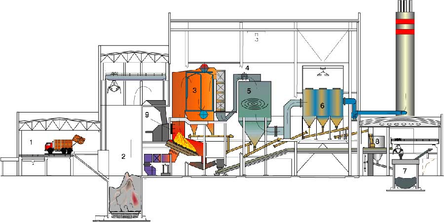 Мусоросжигательный завод № 2 (Москва): 1 – приемное отделение, 2 – бункер ТБО, 3 – котлоагрегат с колосниковой решеткой, 4,5,6 – агрегаты газоочистки, 7,8 – шлаковое отделение, 9 – загрузка ТБО на колосниковую решетку