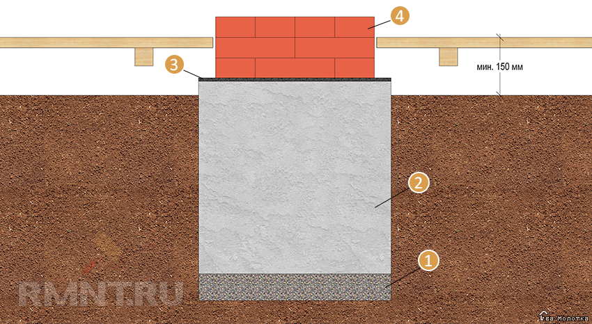 1 — песчано-гравийная подушка 150–200 мм; 2 — бетонный фундамент; 3 — гидроизоляция 2 слоя рубероида; 4 — кирпичная кладка печи
