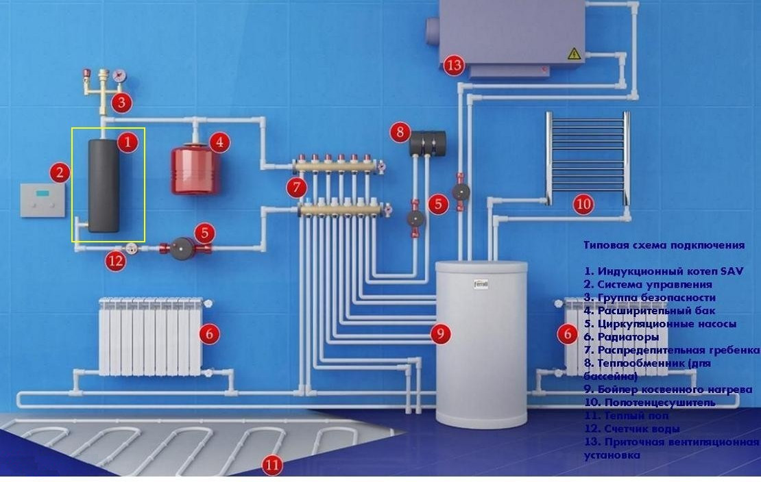 Индукционные котлы могут использоваться как в качестве основного, так и в качестве дополнительного оборудования. К примеру, готовить теплоноситель для нерегулярно используемой системы теплый пол