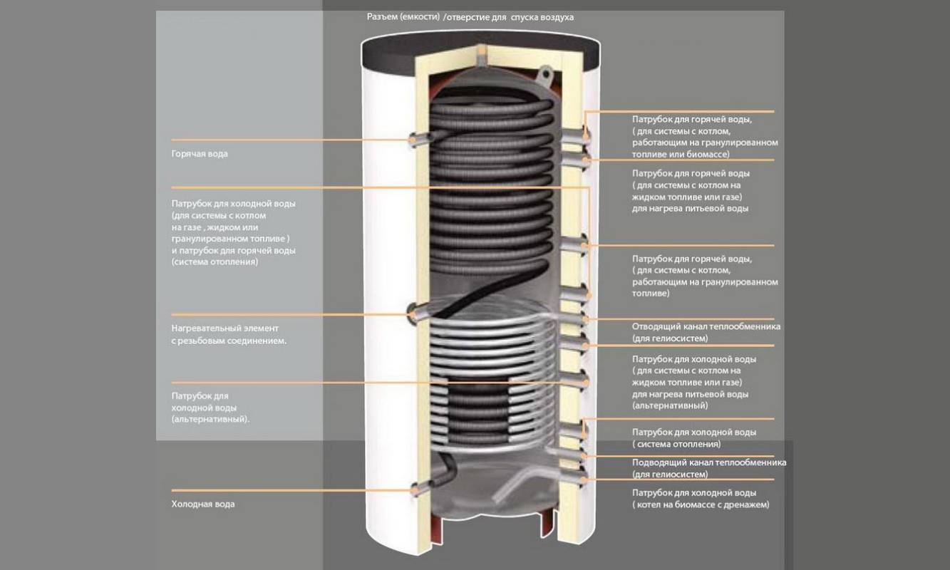 Простейший тепловой аккумулятор представляет собой утепленную стальную емкость. Устойчивость корпуса к давлению воды обеспечивается за счет круглой формы с полусферическими крышками. Более продвинутые теплоаккумуляторы для отопления комплектуются спиралевидным теплообменником для ГВС, электрическими нагревателями и змеевиком, нагревающим воду от солнечных коллекторов.