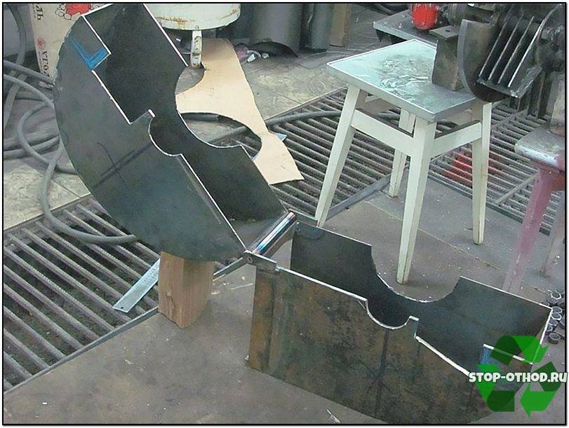 Для защитного кожуха щепореза, а также воронки приемного бункера изделия сгодятся листы металла толщиной не менее 8-12 мм. Для нарезки нужного размера заготовок применяют чертежи. Удобнее будет подготовить выкройки из плотного материала, например картона, а затем вырезать заготовки уже из металла. Следом производятся сварочные работы для формирования объемного вида изделий и устанавливаются ребра жетскости, в качестве которых используют уголки из металла или трубы.