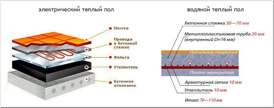 Толщина теплого водяного пола под плитку зависит от способа монтажа и складывается из нескольких цифр: толщина утеплителя, самих труб, стяжки или фанеры чернового пола.