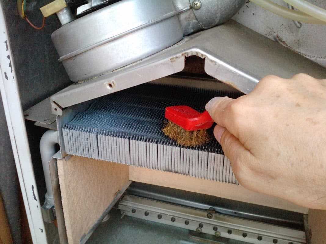 Для проведения ручной очистки надо осторожно снять тепловой обменник, иначе у вас просто не будет открытого доступа к неочищенным поверхностям. После этого необходимо выбрать либо механическую очистку, либо промывку специальными растворами