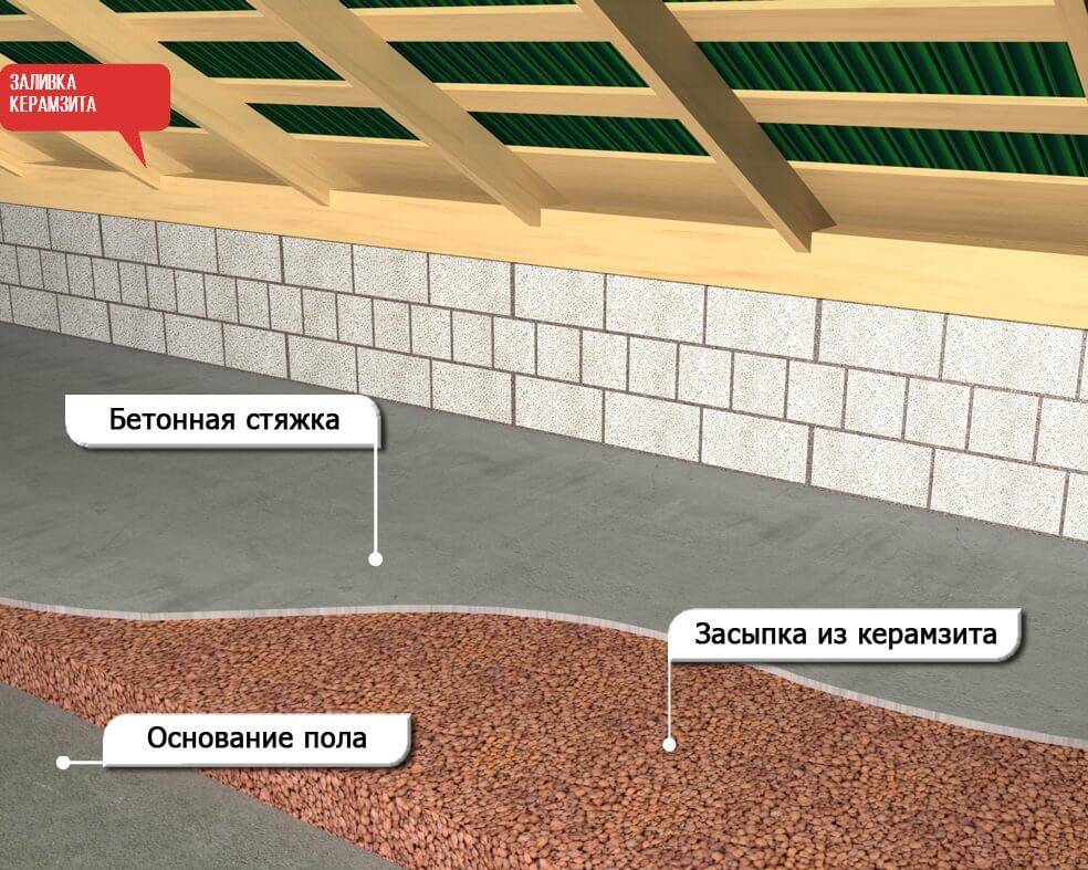 Перед началом укладки производится обработка деревянных конструкций септиками и антипиренами. Изнутри помещения осуществляется установка чернового потолка, который примет на себя вес керамзита.