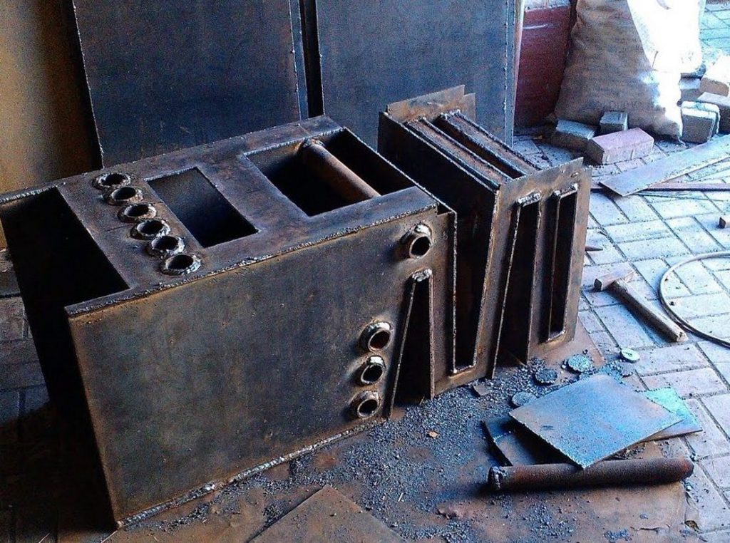 На листах стали делается разметка конструкции согласно чертежам. Сначала вырезается задняя панель и к ней приваривается перегородка для отведения дровяных (угольных) газов. На этом этапе нужно быть очень осторожным, так как сварной шов не всегда может обеспечить должное крепление. Затем к перегородке и задней стенке приваривается боковая и нижняя.