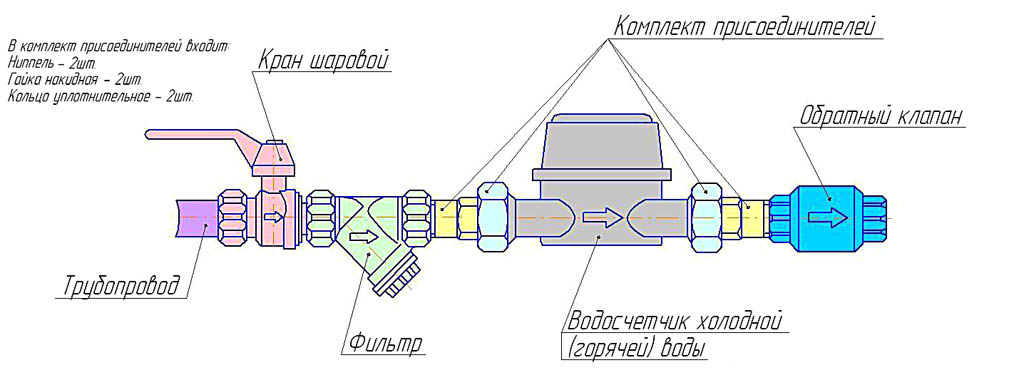 Схема установки водяного счетчика с запорными кранами с двух сторон
