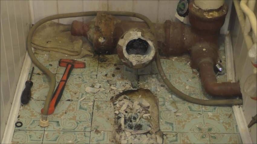 Старые чугунные трубы нельзя сильно бить молотком, потому что они могут расколоться, и придется разбивать пол до самого канализационного стояка и вставлять в него новый отвод