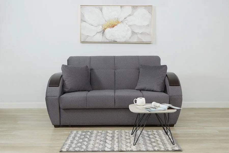 При первом взгляде на этот диван бросаются в глаза закругленные подлокотники, отделанные полимерными накладками. Размер спального места – 164*206 см, раскладывается в состояние кровати благодаря механизму “аккордеон”. Дополнительные вещевые ящики и полки для хранения не предусмотрены.