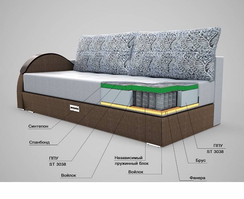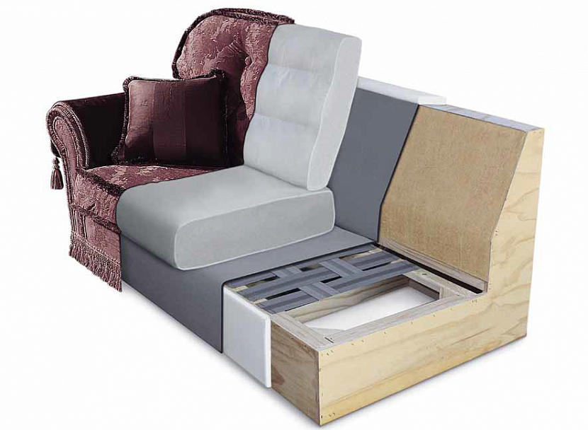 - наполнитель – это внутреннее содержание дивана, на которое ложится или садится человек (пенополиуретан, полиуретановая пена, пружинные блоки и змейки, деревянные ламели, синтепон и другие материалы высокого качества);