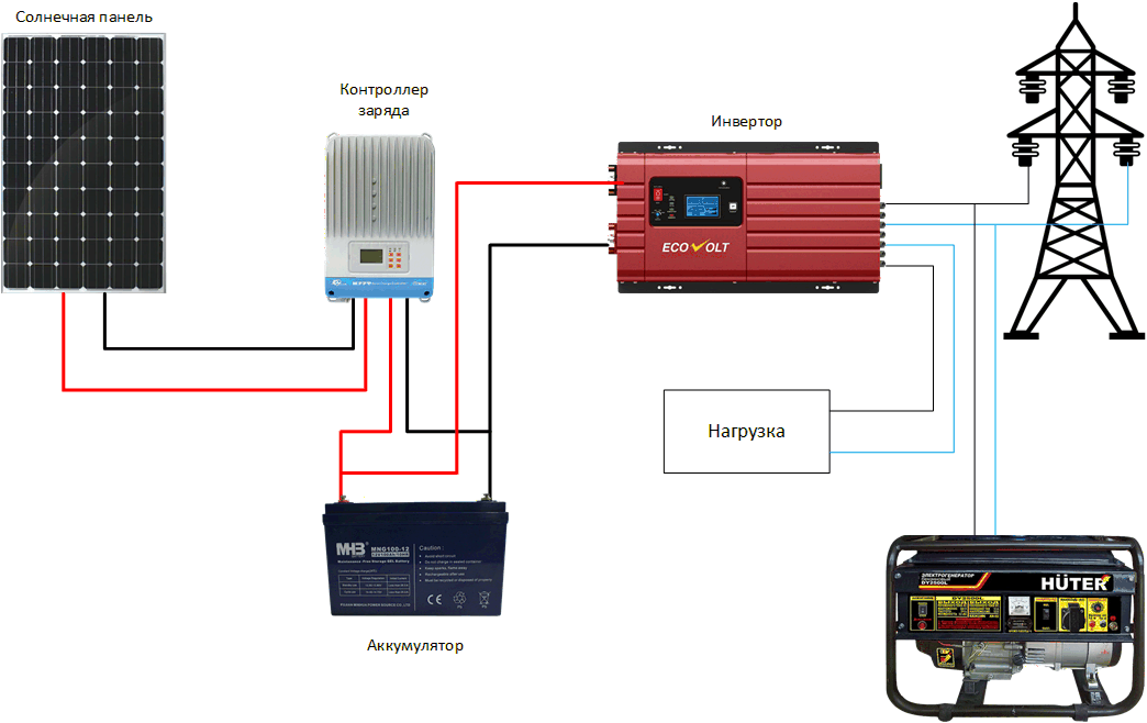 - Инвертор-преобразователь (преобразование получаемого от солнечной батареи постоянного электрического тока в переменный ток).