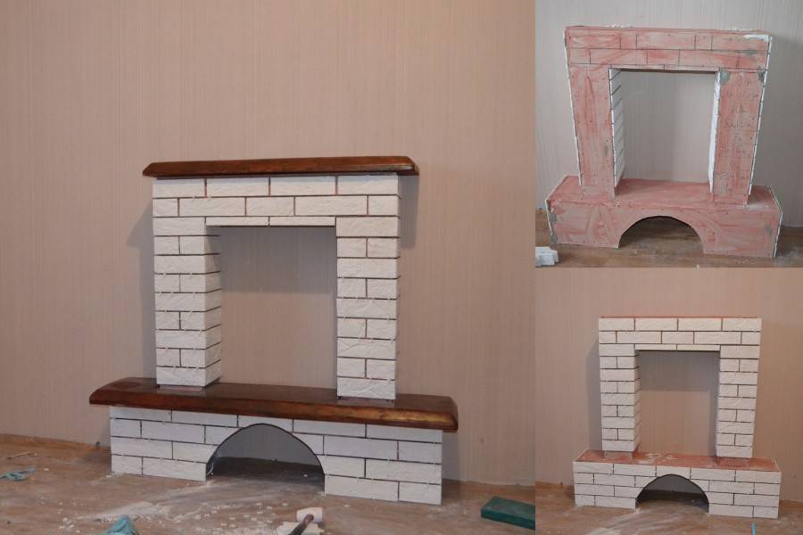 В качестве альтернативы картону для полочки можно вырезать планку из не толстой фанеры. Еще дин вариант полочки – это пенопласт. Материал легкий и прочный. Такая полка также позволит скрепить каркас камина.
