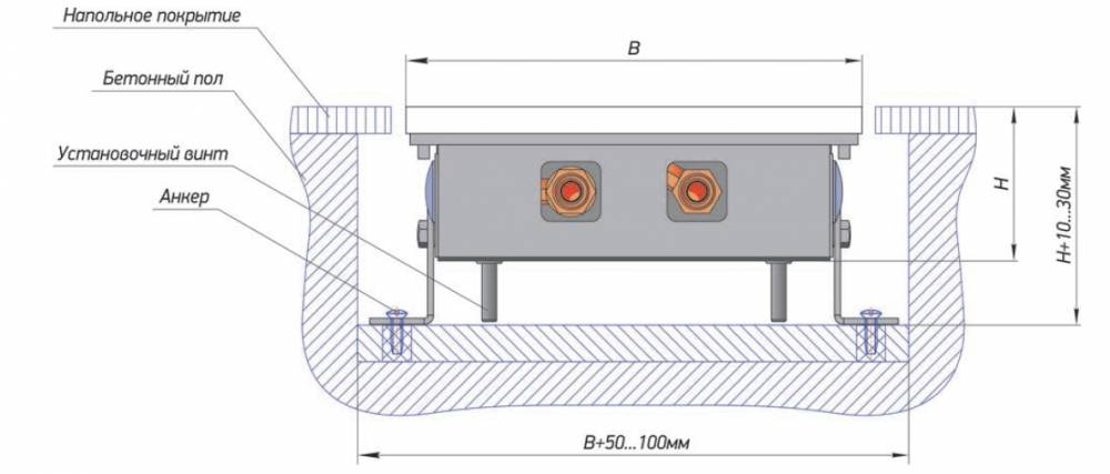 - Встраиваемые. Прячутся внутри конструкции пола, на поверхности видна только декоративная решетка.