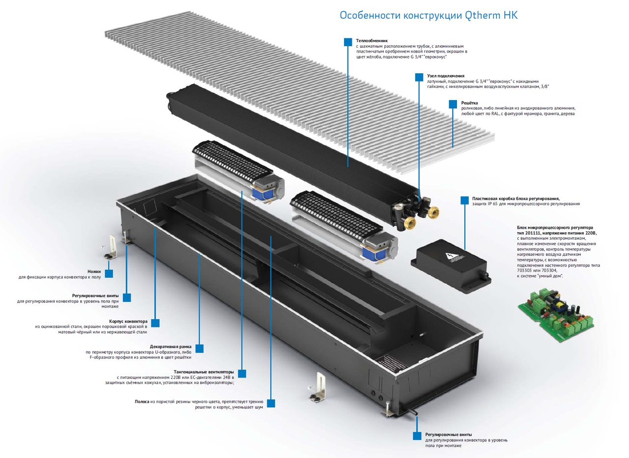 Само устройство обогревающего оборудования серии незамысловато. Так, в состав любой модели входит корпус с алюминиевым бортиком, теплообменник, состоящий из медно-алюминиевых трубок, узел подключения и защитная декоративная решетка из алюминия. В состав продажного комплекта в обязательном порядке включается комплект для проведения установки устройства в пол.