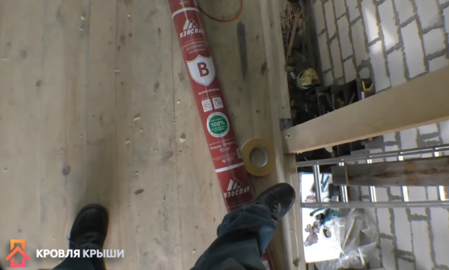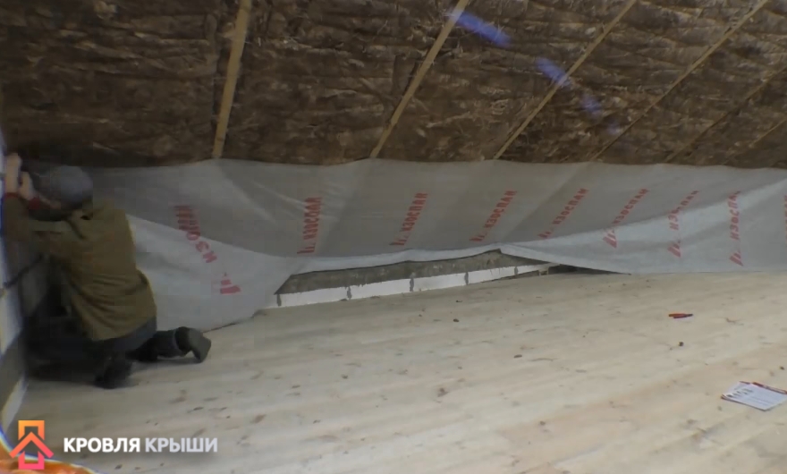 Узкую заводскую пленку надо фиксировать не горизонтальными, а вертикальными полосами. Стыки располагайте на стропилинах, в этих местах проще приклеивать скотч, есть упор. Не путайте ветрозащитные материалы с парозащитными. Первые пар пропускают, их надо монтировать между минеральной ватой и кровлей. Вторые полностью не пропускают пар, они должны устанавливаться с внутренней стороны мансардного помещения.