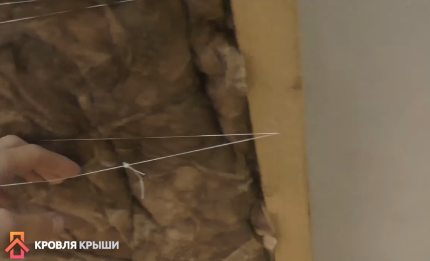Таким же способом утепляйте всю крышу и потолок мансарды (если он есть по проекту). Если вы работаете без помощника, то минеральную вату можно предварительно удерживать любыми деревянными подпорками, после того как натянется нить, подпорки убираются. Нить надо брать только из искусственных материалов, она не должна бояться влаги.