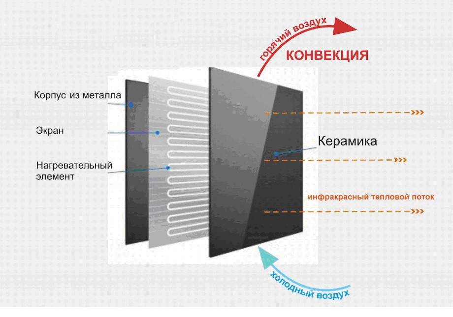 Работа устройств может быть основана на принципе инфракрасного излучения или на конвекции воздуха. Керамические отопительные приборы греют воздух внутри помещения, а также предметы, которые расположены в непосредственной близости.