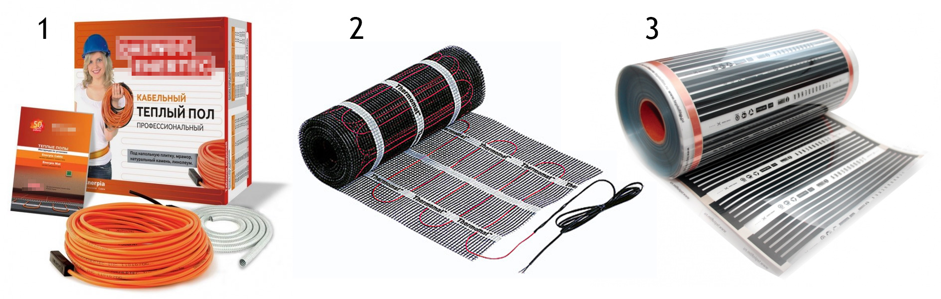 Виды электрических теплых полов:1 – Кабельный; 2 – Кабельный с армирующей сеткой; 3 – Пленочный (инфракрасный).