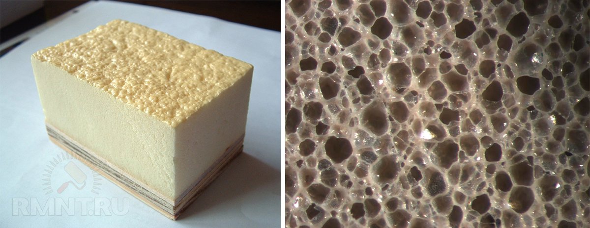 При смешивании компоненты А и Б вступают в активное взаимодействие, при этом выделяется огромное количество углекислого газа, который помогает материалу хорошо вспениваться. После своего застывания полиуретан и образовывает слой утепления, что состоит из большого количества небольших, герметично закрытых ячеек, которые полностью заполняются углекислотой.
