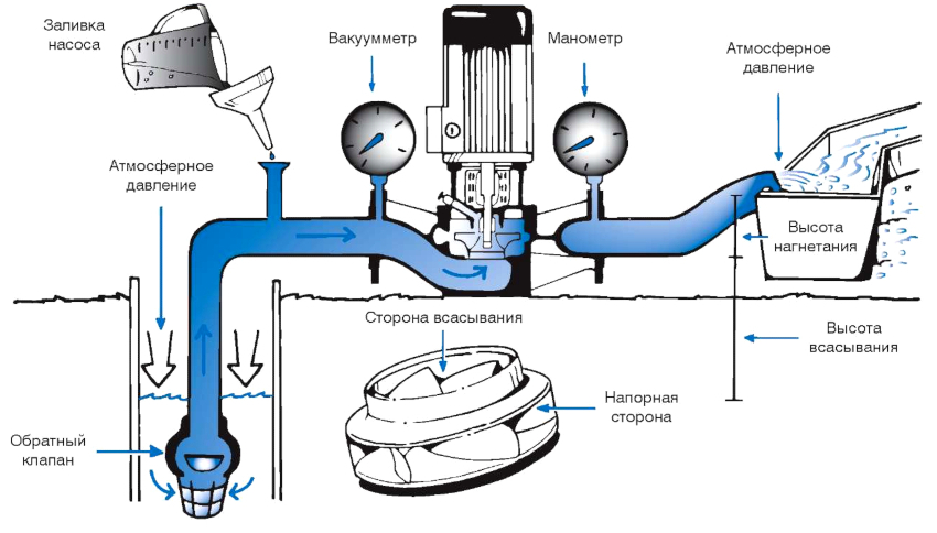 Центробежные насосы имеют такое строение рабочего колеса, при котором лопасти способствуют разбрасыванию воды по всем стенкам внутренней камеры. Повышение давления обеспечивается благодаря центробежной силе. Насосы боятся попадания внутрь воздуха, поэтому дополнительно оснащаются эжектором, который перед запуском и в процессе работы откачивает из насоса воздух.