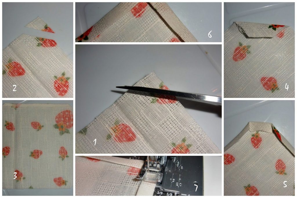 - Проведенные линии помогут вам ровно отрезать ткань в четырех уголках. Те края полотна, которые расположены с двух сторон от срезанного уголка, заверните в центр. Вершину уголка пригладьте по направлению к центру и сделайте второй сгиб по заглаженным линиям.