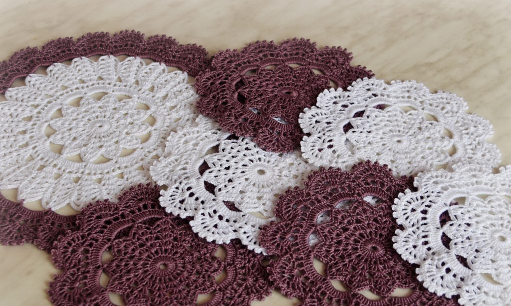 Набор сервировочных салфеток для чайного стола включает в себя одну большую и шесть маленьких изделий ручной работы. Для изготовления использовалась пряжа СОСО (два мотка белого и темно-коричневого цвета) и крючок 1,5 Кловер.