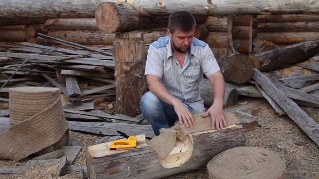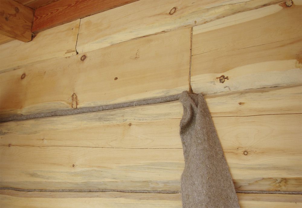 Наиболее часто для утепления используется джутовый войлок в рулонах. Лента войлока разворачивается на поверхности бревна и крепится степлером.