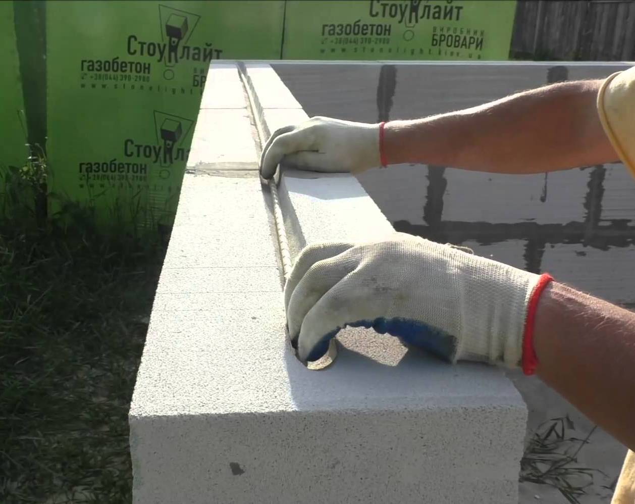 - Перепадов между верхними плоскостями соседних блоков быть не должно, это может спровоцировать появление трещин. Их подшлифовывают – как и половинки блока, которые нужно распиливать, чтобы закончить кладку ряда. Следующий ряд начинают класть с той стороны, где установлен добор – это обеспечит необходимое смещение вертикальных швов.