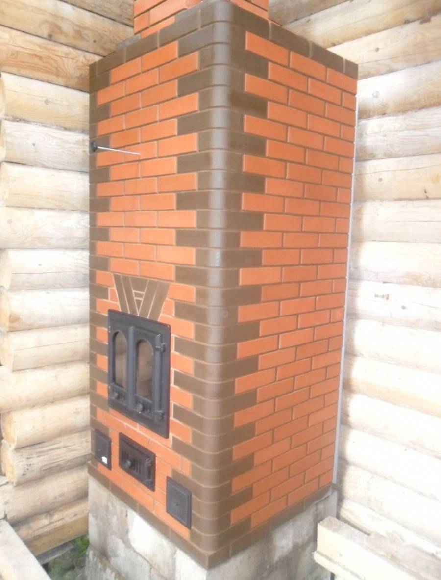 Размеры конструкции увеличиваются при использовании клинкерного облицовочного кирпича, поэтому использовать их вместо полнотелого материала не рекомендуется. При отделке изразцами обеспечивается долговечность (материал служит десятки лет), кроме того, его можно демонтировать для облицовки других отопительных конструкций.