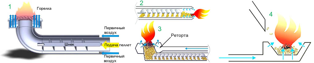 Горелки с подачей вторичного воздуха в дожигатель (поз. 2) или с ретортой, формирующей первичный и вторичный потоки непосредственно в чаше (поз. 3) лишены большинства этих недостатков. Горелка с дожигателем практически никогда не закоксовывается, но чистить ее вручную нужно все равно раз в неделю, а горелке с ретортой чистка нужна ежемесячная, да и то по результатам осмотра.