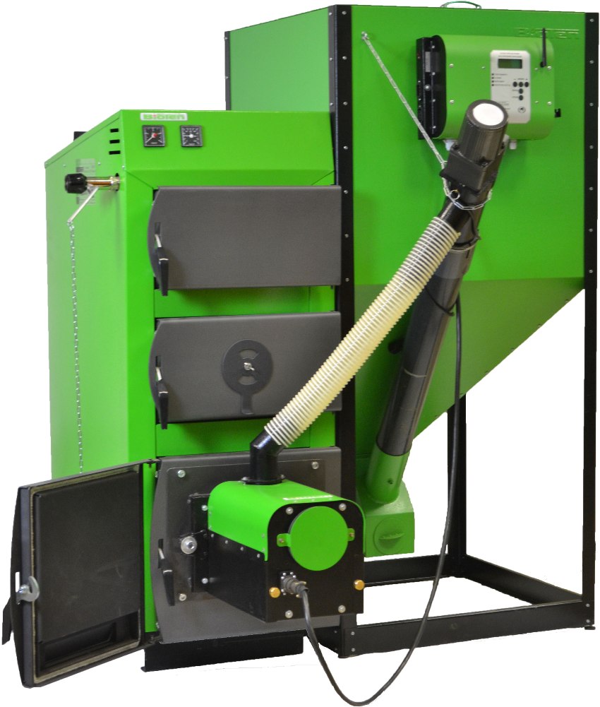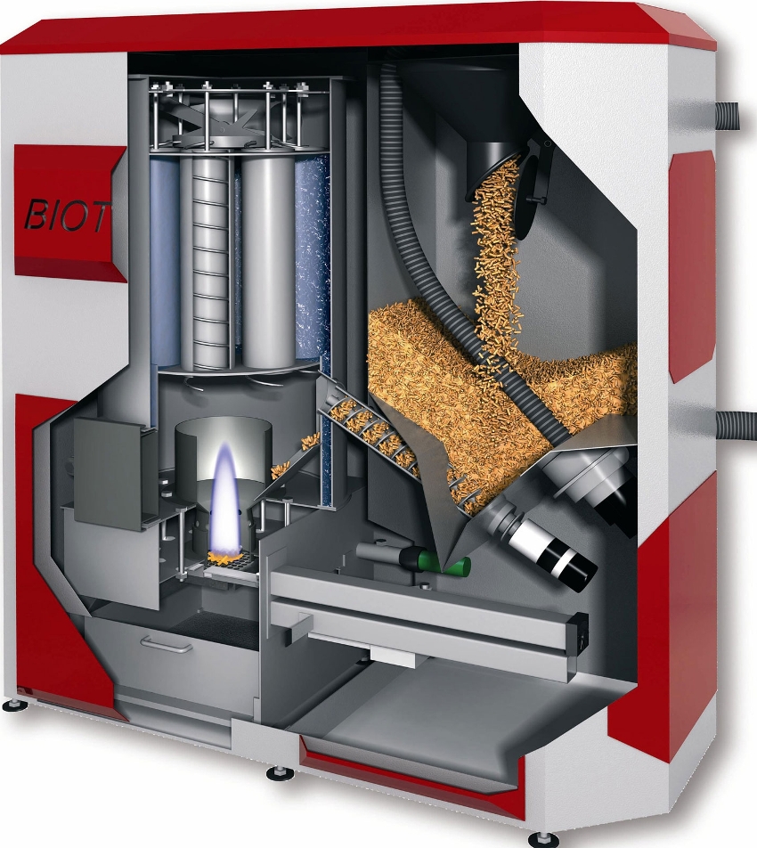 Автоматизированная техника имеет пеллетную горелку с подающим механизмом, а также модуль управления и отдел для пеллет, объемом в 225 л. Данной емкости достаточно для беспрерывного функционирования кота на протяжении 5 дней с гарантированным высоким КПД – 92%.