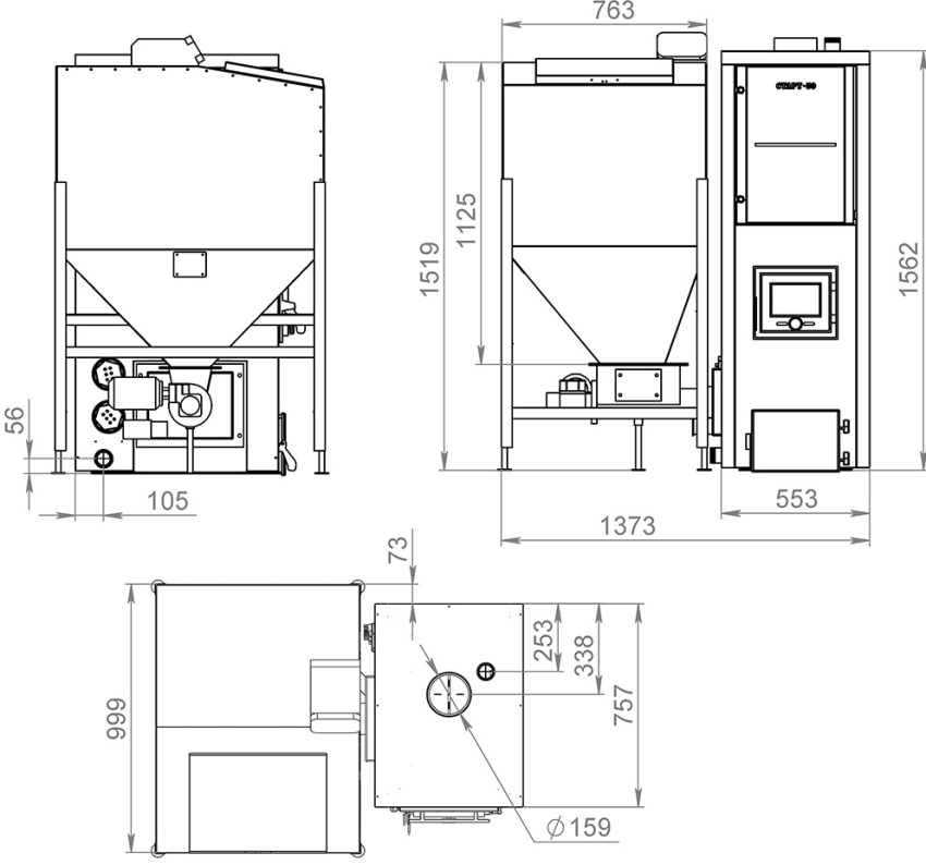 Топочный отдел. Представлен камерой, в которой происходит горение твердотопливных гранул. Оснащается факельной или реторной газовой горелкой и имеет две дверцы (смотровую и очистную).