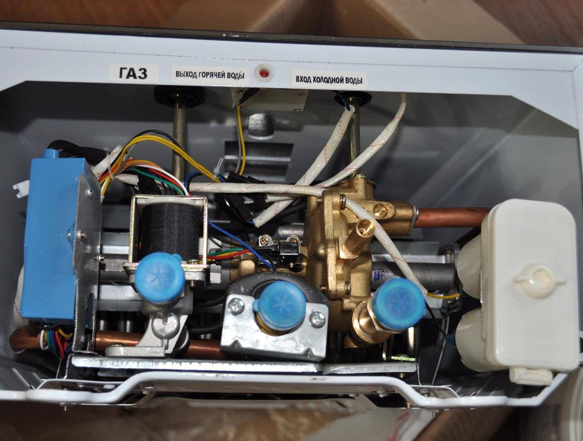удалять накипь и сажу с узлов проточного водонагревателя;