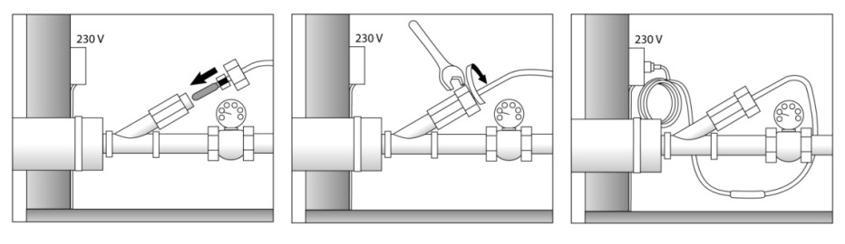 При обогреве трубопроводов терморегулятор устанавливают в удобном защищенном от вредных факторов окружающей среды месте как можно дальше (жилой дом), при этом возникает необходимость в герметичном соединении короткого кабеля с длинным проводом, идущим от дома. Для этого используют бытовой фен, специальные муфты и зажимы, монтажные работы проводят следующим образом: