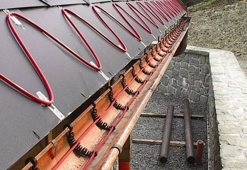 Кабель монтируется и внутри водосточных желобов, здесь можно укладывать две нити, мощности будет достаточно, но нужно учитывать и диаметр. Если он большой, то можно добавить третью для эффективного прогревания