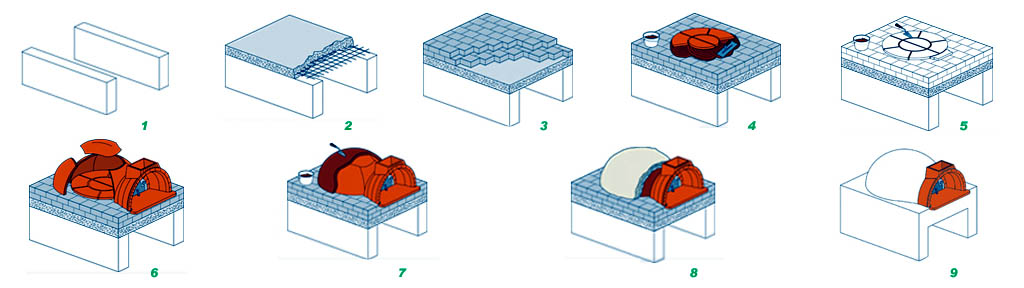 Для постройки неаполитанской печи надо соблюдать определенный алгоритм действий, он состоит из четырех основных шагов.