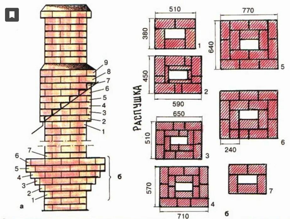 Кирпичную трубу изолируют либо с помощью кирпича, либо бетона. Для того, чтобы кирпичный ППУ надежно соединялся с трубой, делается «распушка» – это постепенное увеличение сечения трубы за счет дополнительных кирпичей.