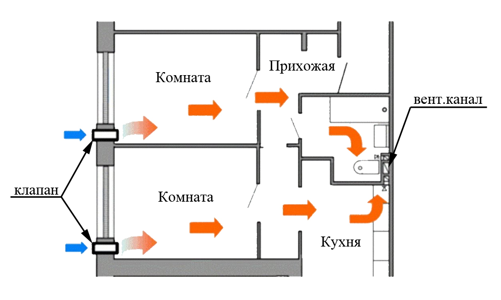 В старых домах приточный воздух может попадать внутрь через небольшие щели в оконных проемах, отверстия между нижним краем дверного полотна и полом. Если в доме используются пластиковые стеклопакеты и применяются современные герметизирующие материалы, для притока чистого уличного воздуха придется дополнительно монтировать в оконных проемах или стенах специальные приточные клапаны.