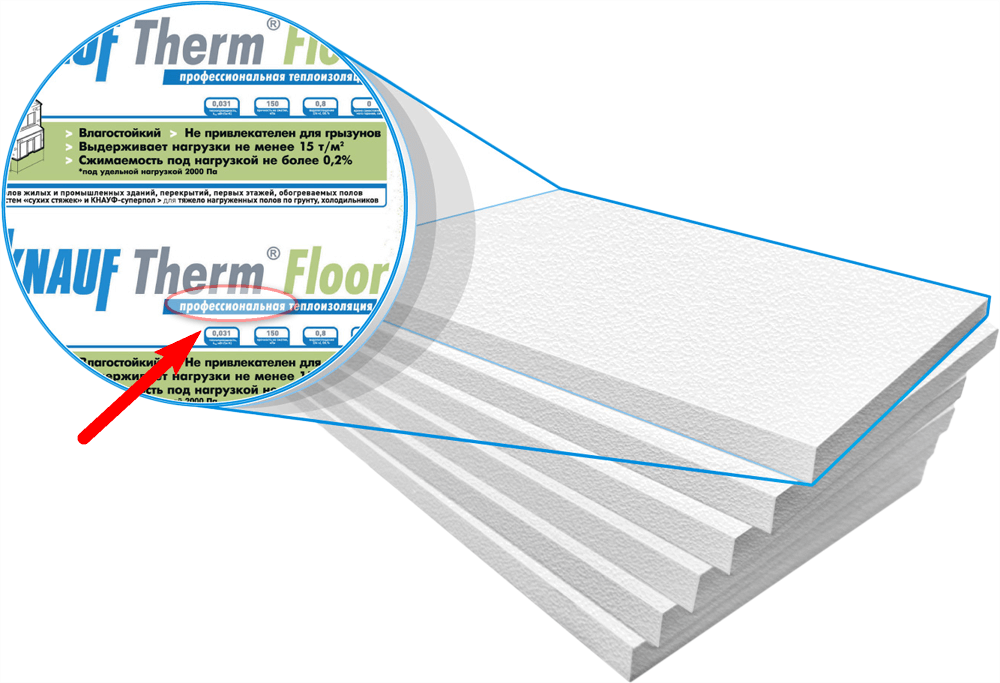 Недавно разработанный Knauf Therm Floor – прочный материал для утепления цоколей, фундаментов, отмостки с нагрузкой до 12 т на м2. Пенопласт Флор имеет влагопоглощение до 0,8% от объема утеплителя. Используется в обустройстве систем «теплый пол».